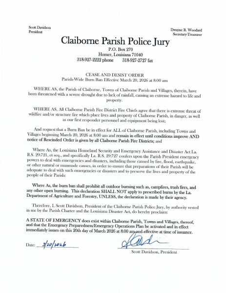 March 20, 2026A parish wide burn ban is in effect as of 8:00 am Friday morning, March 20, 2026, until further notice.